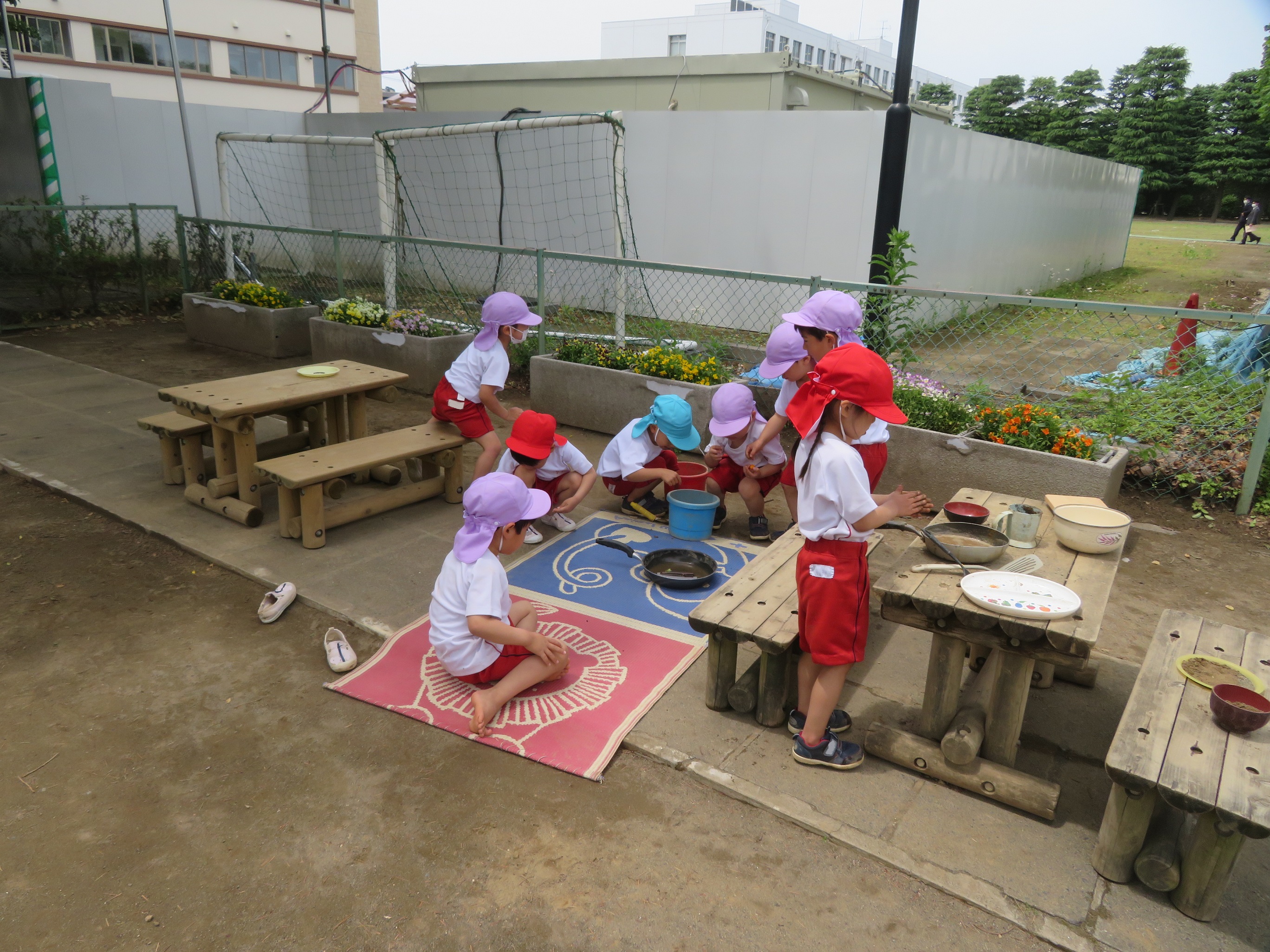 5月14日年中組 2021年5月14日 びっくり山でダイナミックに遊びを楽しんだり、ダンゴムシの足の動きをじっと見たり、友だちと一緒にごちそうを作ったりする姿が見られている年中組です。 見たり触れたりした体験や友だちとのつながりを大切に過ごしています。