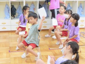 1つ目のお楽しみは「ねんちょう ほしぞら ラリーゲーム」です。イントロクイズや幼稚園に纏わるクイズ、カプラ積み上げゲーム、椅子取りゲーム、新聞紙じゃんけんをラリー形式でグループごとに挑戦しました。最後に園長先生から「劇団星美 特別招待券」「花火 特別鑑賞券」をいただきました。ラーリー後のアイス美味しかったです!