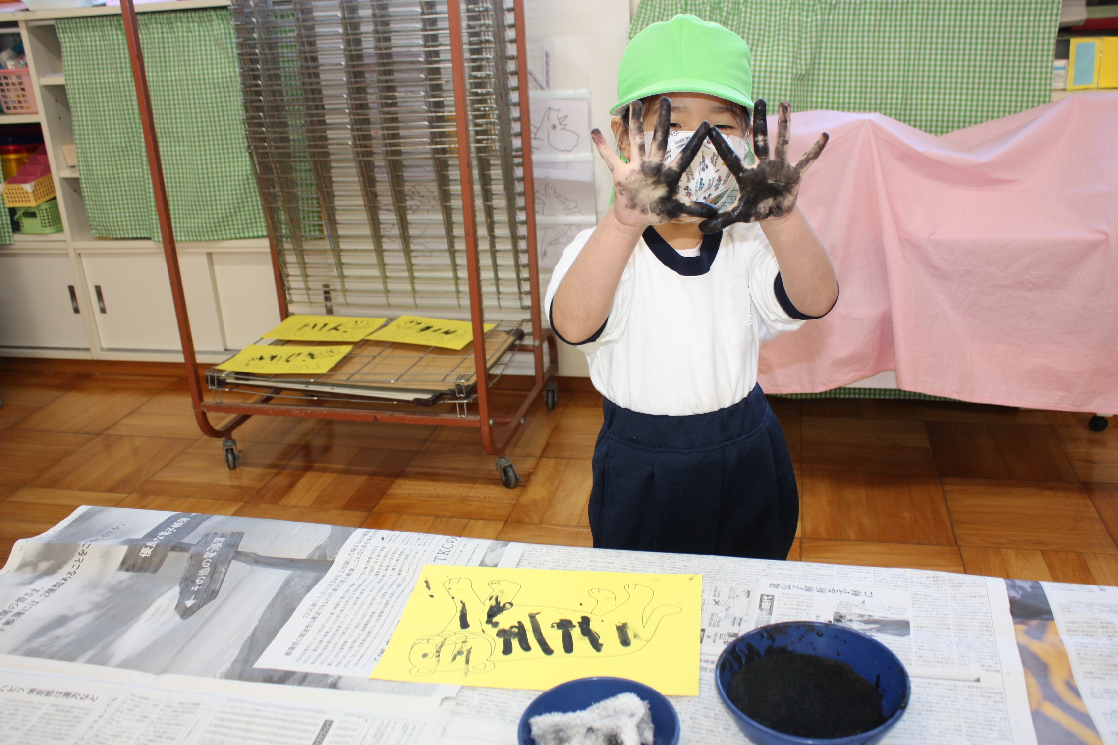 年中組では自分で作った紙芝居の読み聞かせをしたり、年少組は今年の干支であるトラに模様を指で描いたりのびのびと園生活を送っています。