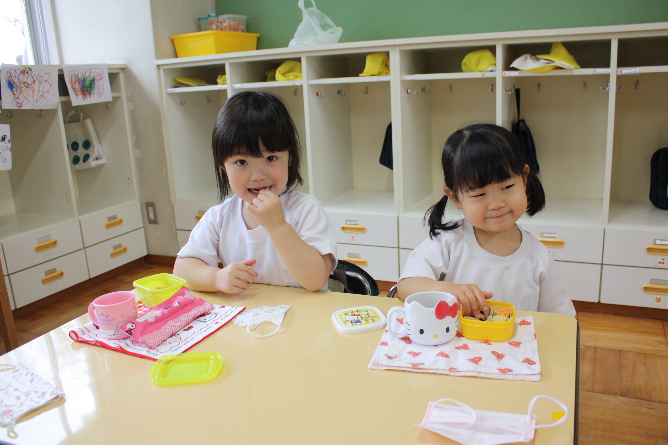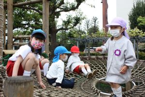 年少組おやつと園庭 2022年4月20日 年少組は補食と昼食準備の前段階としておやつを食べています。 年中組はお気に入りの場所を見つけ始めました。 年長組は大縄跳びに挑戦したり、友だちや先生と跳んだりして一緒に取り組むことを楽しんでいます。