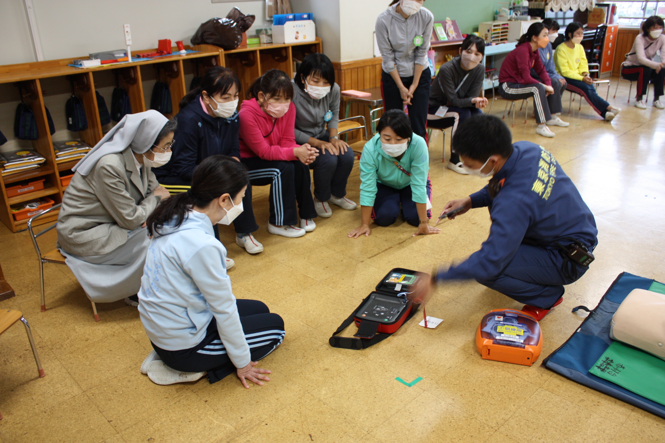 AED訓練 2022年6月14日 今日は保育後に赤羽消防署よりAED訓練の指導にいらしていただきました。 119番通報、呼吸の確認、AEDの使い方などを指導していただき、デモ機で実際にAEDを使う訓練をしました。 最後にプールでの注意や怪我の対応など丁寧に教えていただき、実りある訓練になりました。