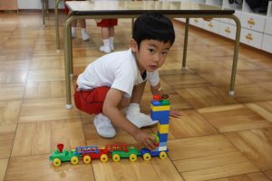 昼食後の年少組 2023年5月15日 昼食後の年少組はブロック、ままごと、粘土、パズル・・・やりたい遊びをする中で同じ場にいる、同じようにしてみる、同じように作ってみるなど同じを楽しみながら友だちに関わろうとする姿が見られています。