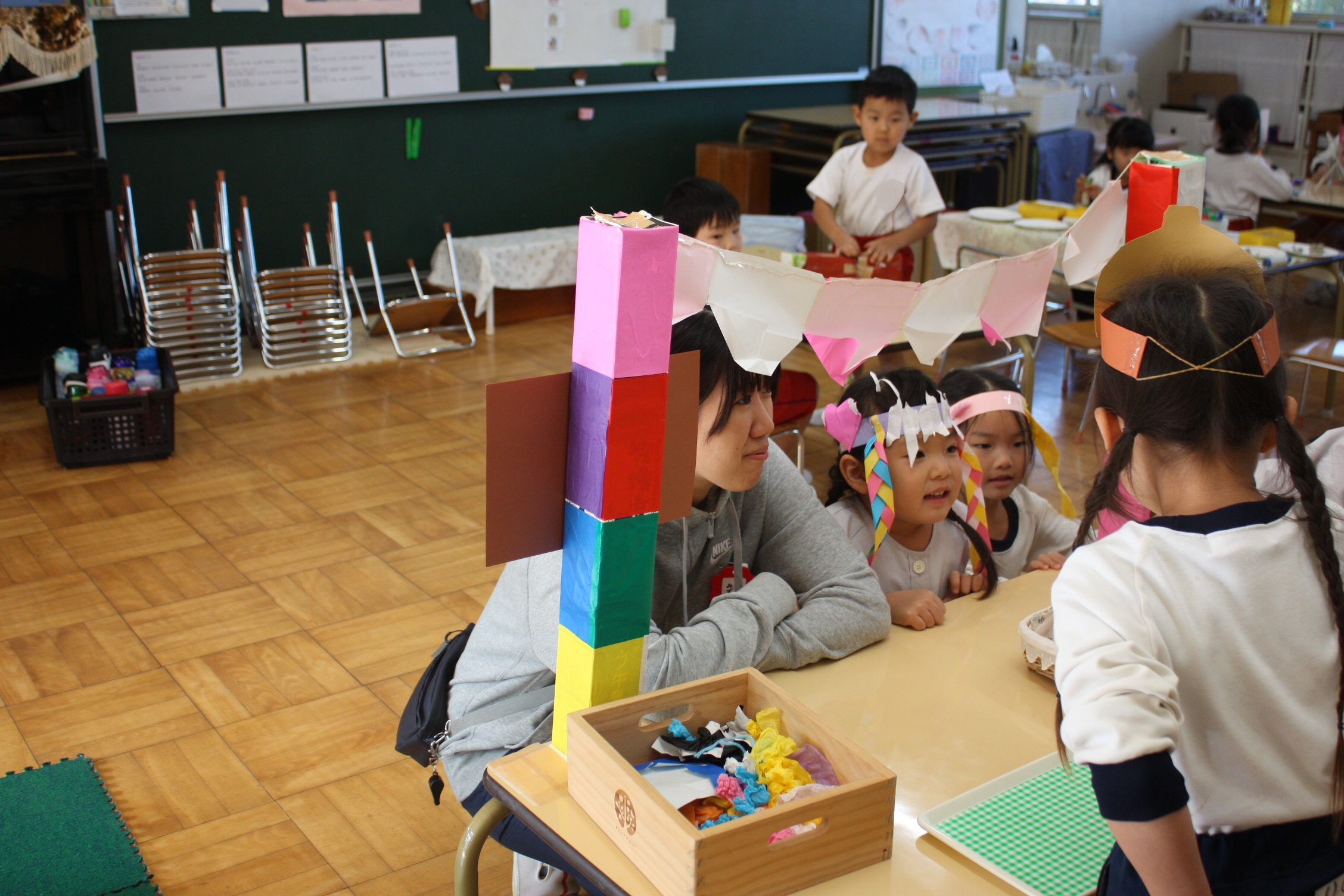 年中組の昼食後は室内でごっこ遊びや遊びの中で必要なものを友だちと一緒に考えて作ったり、イメージしたことを表現する楽しさを味わっています。
