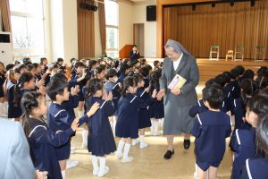 管区長様公式訪問 2023年11月29日 今日はサレジアンシスターズ日本管区のシスター宮脇管区長様をお迎えし「いつもたくさんのおいのりをありがとうございます」と感謝の気持ちを伝え、毎月行っているおにぎり献金をお渡ししました。室内や園庭でお会いすると縄跳びを見ていただいたり家族のことをはなしたり短い時間でしたが、暖かいひと時を過ごすことができました。