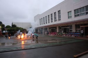 雨が降っていましたが、子どもたちはテラスからキャンファイヤーと花火を見ました。