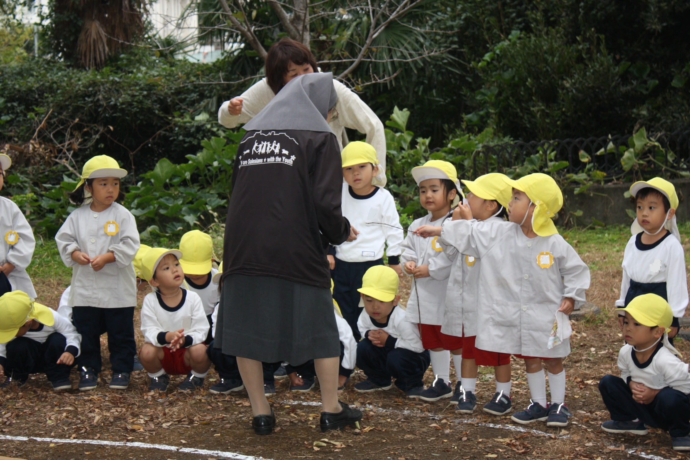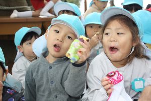 焼き芋 2024年11月7日 昨日森の入り口の畑で収穫した芋を落ち葉で焼き、焼き芋を食べました。幼稚園の畑で収穫したサツマイモは1人では抜けないほど大きな芋も収穫出来ました。 森は風が冷たく寒いと感じることもありましたが焚火の近くはとても暖かかったです。年少組は小さな小枝を拾っては園長先生に渡し、焚火の中に入れてもらっていました。 焼き上がった芋はほかほかのうちに森で食べました。年長組はお昼も森で食べ森を満喫しました。 秋の実りに感謝の一日でした。