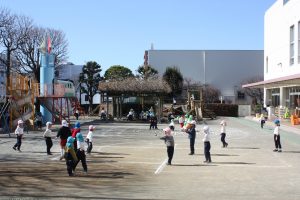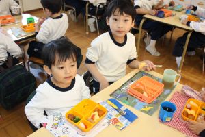 学年混合のチームに分かれ玉入れをしました。最後に先生チームも行い、園庭は子どもたちや先生たちの元気いっぱいの声が聞こえ笑顔に満ち溢れていました。玉入れ後の仲良しランチでは2階の年長組で食べた年少組は初め緊張した様子も見られていましたが、昼食後園庭で一緒に遊ぶ姿もあり子どもたちも先生たちも学園のモットーである「共に喜び、共に生きる」があちらこちらで見られた1日でした。