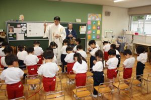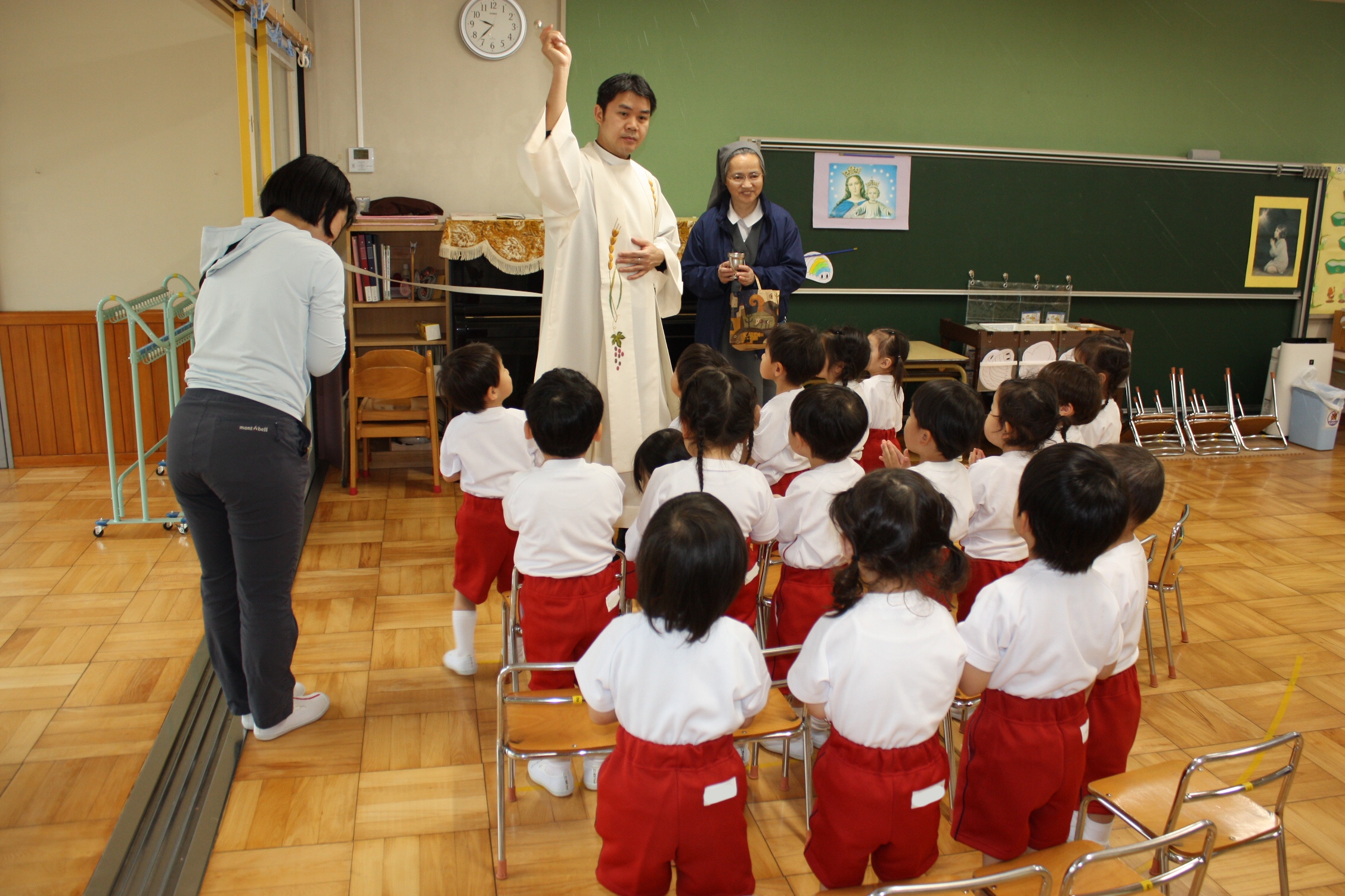 園舎祝福 2025年4月28日 今年度も幼稚園で大きなケガや病気なく過ごせますように、武井神父様をお迎えして園舎祝福をいたしました。 初めて体験する年少組の子どもたちは少し不思議そうに神父様や聖水を見つめている様子も見られましたが、丁寧に手を合わせ一緒にお祈りをしていました!